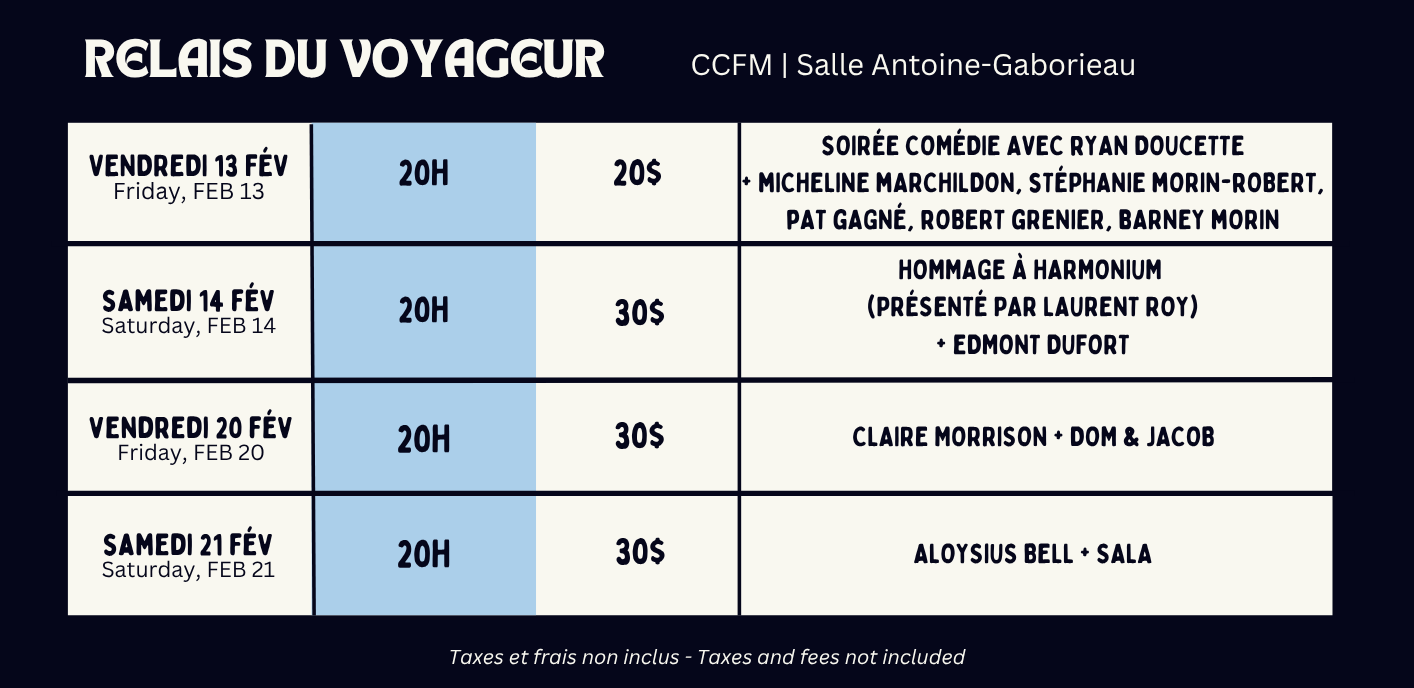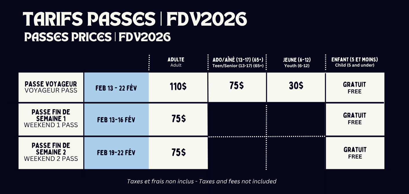 L’horaire complet du Festival du Voyageur sera disponible à partir du 13 janvier 2026.